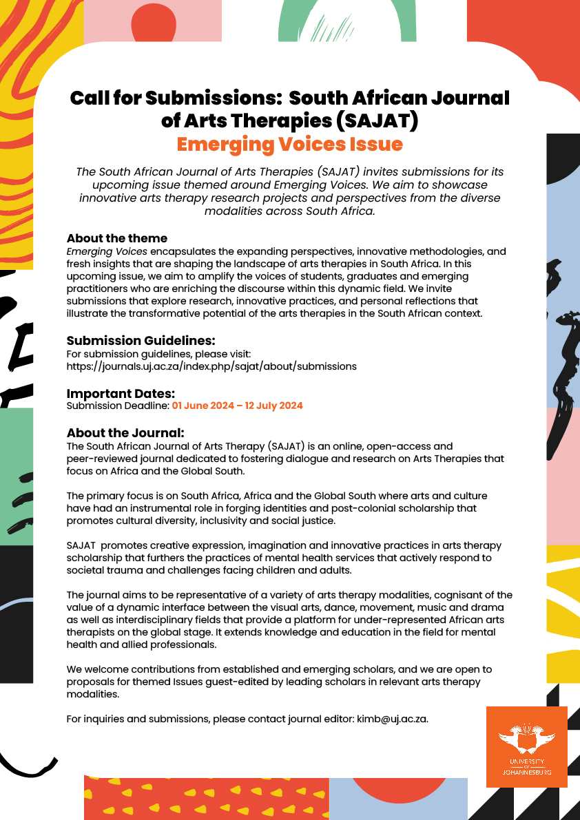 The South African Journal of Arts Therapies invites submissions for its upcoming issue themed around “Emerging Voices.” We are eager to showcase the innovative perspectives and diverse experiences of individuals studying in various arts therapies modalities across South Africa.